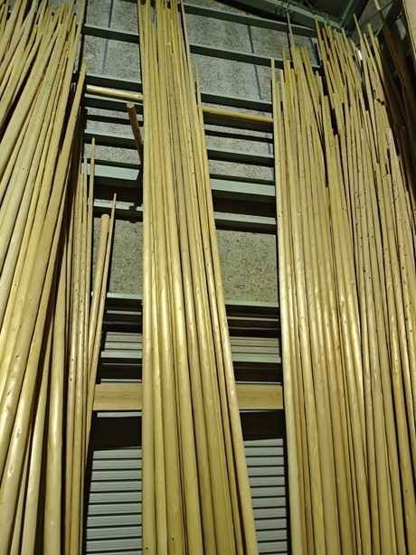 たるき丸太、垂木丸太、タルキ丸太、海布丸太など呼び名がありますが、化粧用垂木に使用することの多い細い丸太です。ときおり換気もかねて倉庫内の並べ替えです。