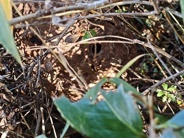今年は猛暑で蜂の巣を見かけないと思っていたら、冬に生け垣の中で発見。